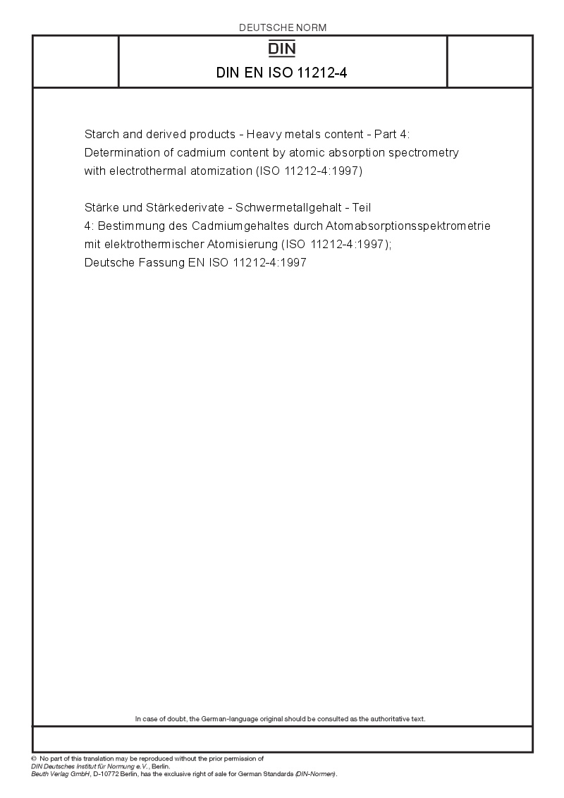 Stärke und Stärkederivate - Schwermetallgehalt - Teil 4: Bestimmung des Cadmiumgehaltes durch Atomabsorptionsspektrometrie mit elektrothermischer Atomisierung (ISO 11212-4:1997); Deutsche Fassung EN ISO 11212-4:1997
