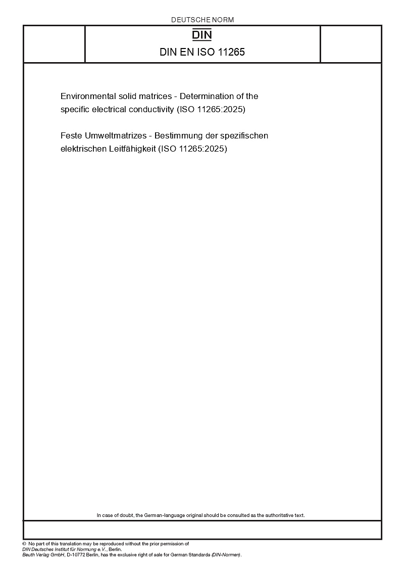 | Name: | Environmental solid matrices - Determination of the specific electrical conductivity (ISO 11265:2025) |