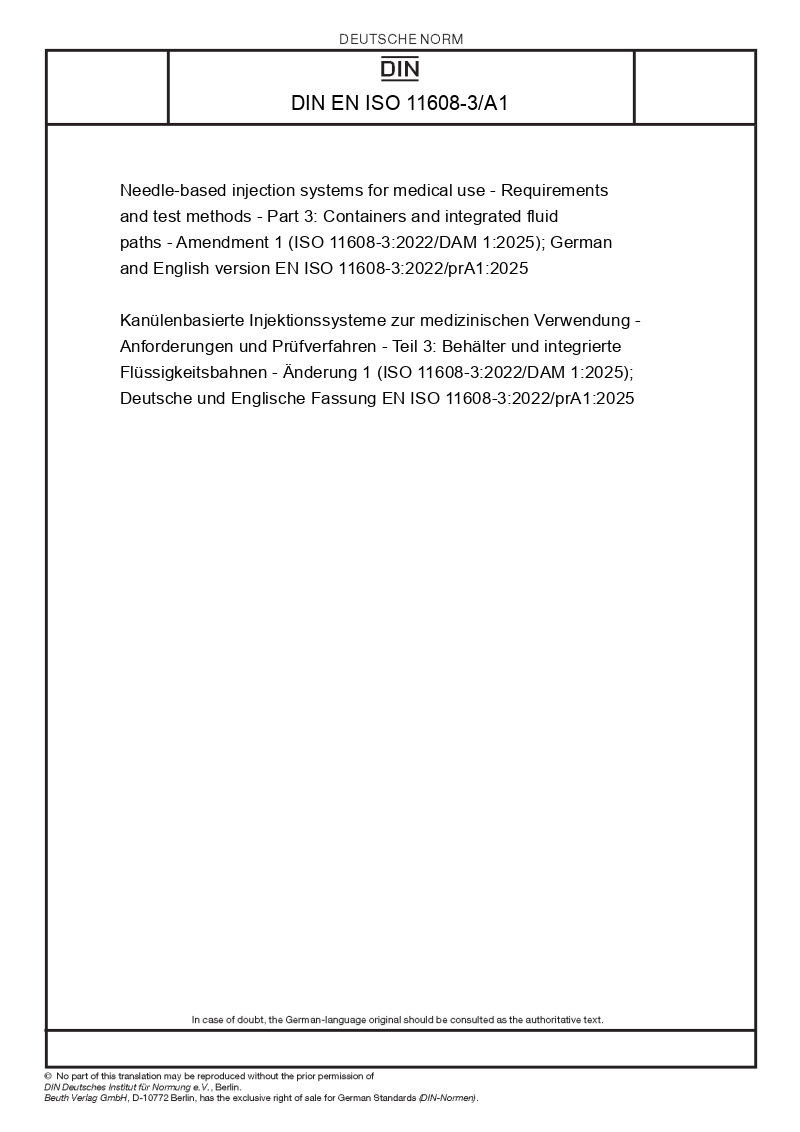 | Name: | Needle-based injection systems for medical use - Requirements and test methods - Part 3: Containers and integrated fluid paths - Amendment 1 (ISO 11608-3:2022/DAM 1:2025); German and English version EN ISO 11608-3:2022/prA1:2025 |