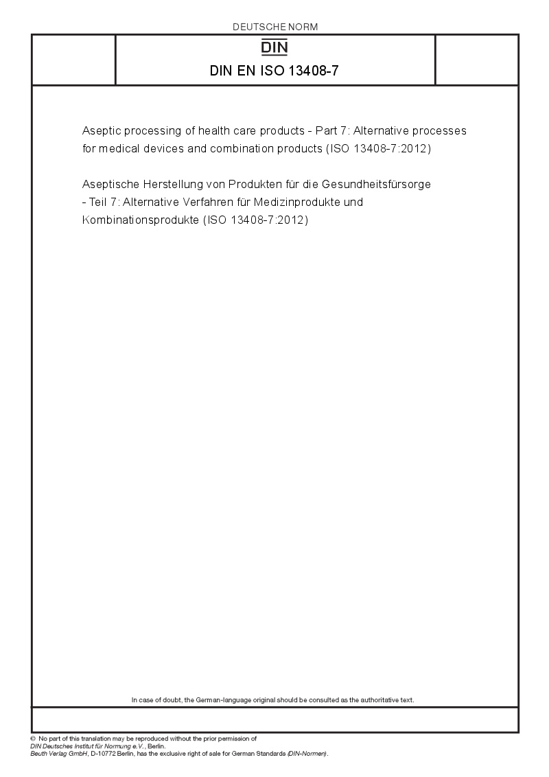 Aseptische Herstellung von Produkten für die Gesundheitsfürsorge - Teil 7: Alternative Verfahren für Medizinprodukte und Kombinationsprodukte (ISO 13408-7:2012)