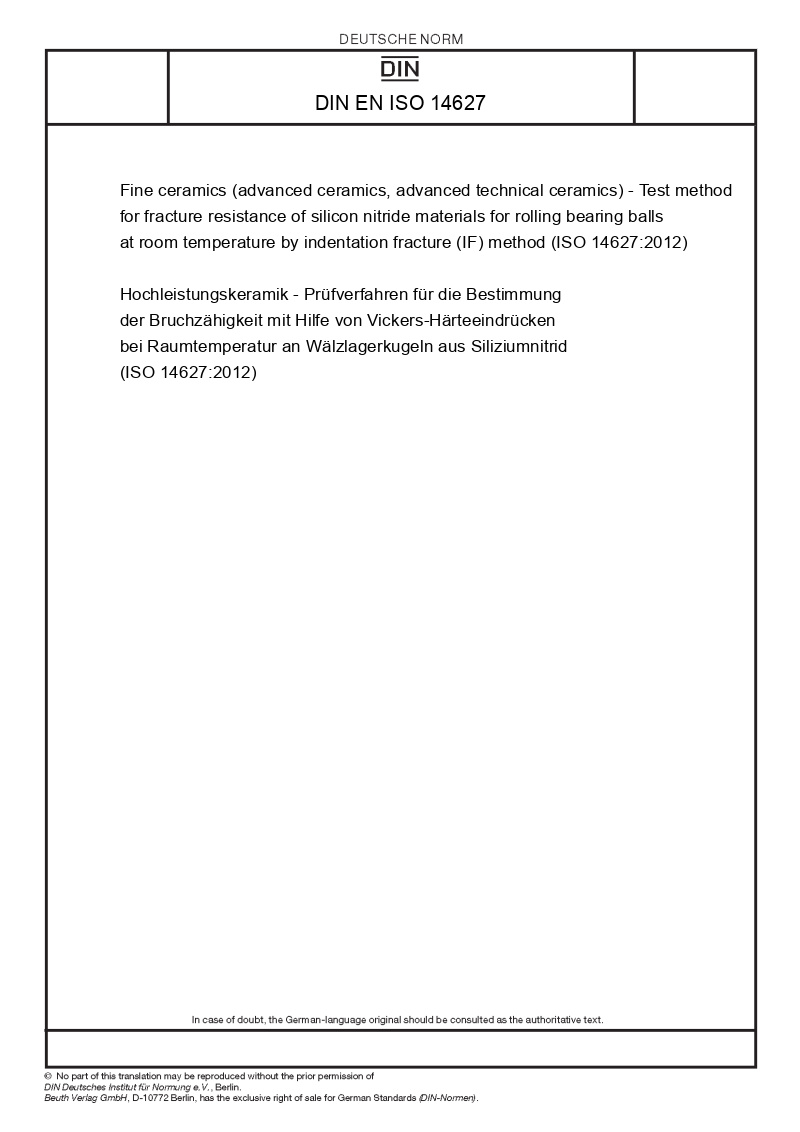 | Name: | Fine ceramics (advanced ceramics, advanced technical ceramics) - Test method for fracture resistance of silicon nitride materials for rolling bearing balls at room temperature by indentation fracture (IF) method (ISO 14627:2012) |