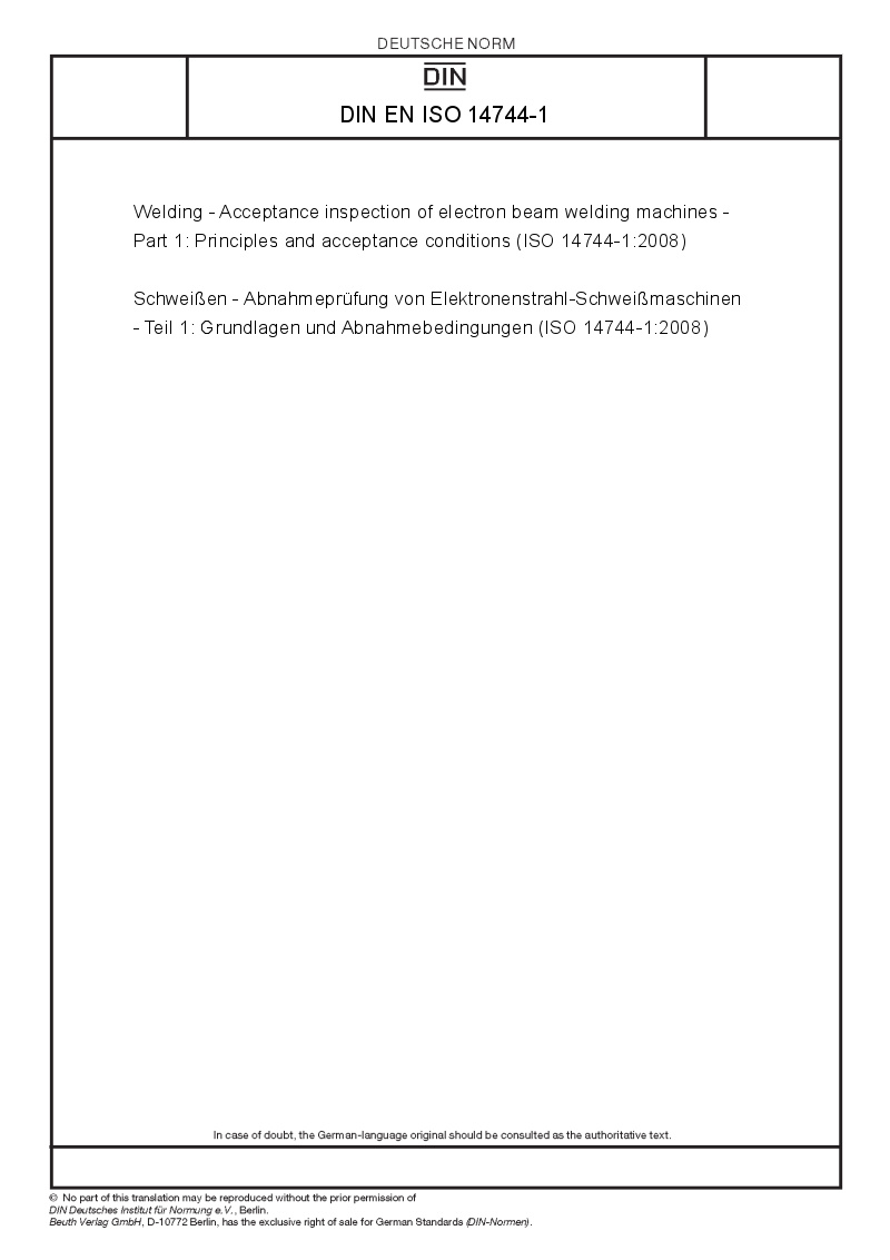 | Name: | Welding - Acceptance inspection of electron beam welding machines - Part 1: Principles and acceptance conditions (ISO 14744-1:2008) |