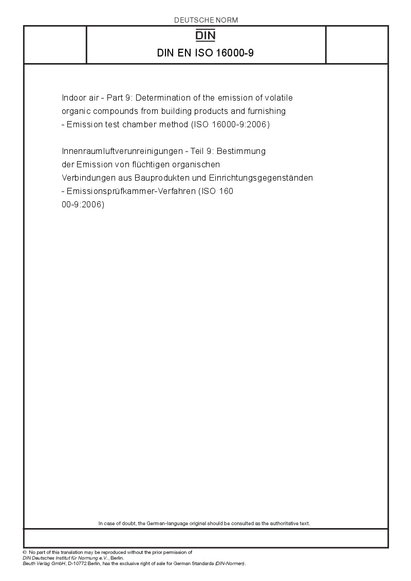 | Name: | Indoor air - Part 9: Determination of the emission of volatile organic compounds from samples of building products and furnishing - Emission test chamber method (ISO 16000-9:2024) |