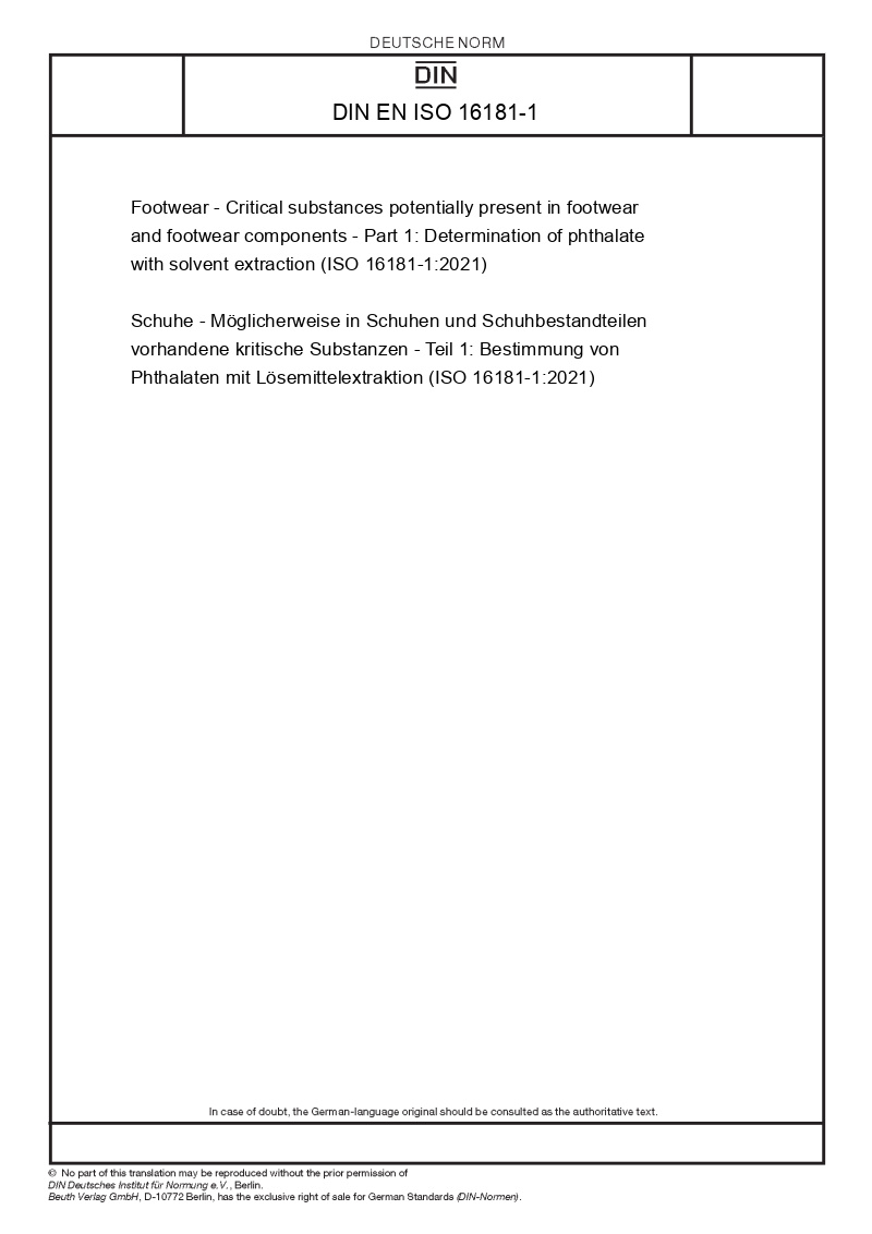 | Name: | Footwear - Critical substances potentially present in footwear and footwear components - Part 1: Determination of phthalate with solvent extraction (ISO 16181-1:2021) |