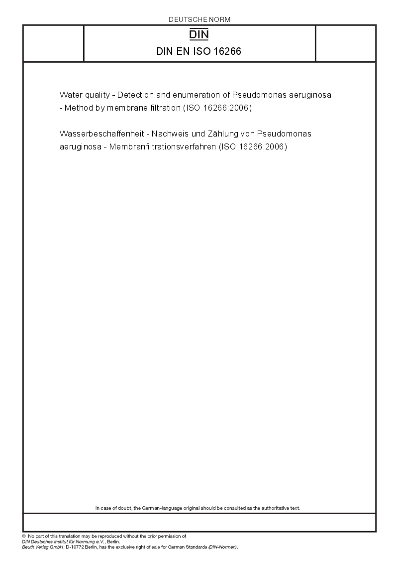 | Name: | Water quality - Detection and enumeration of Pseudomonas aeruginosa - Method by membrane filtration (ISO 16266:2006) |