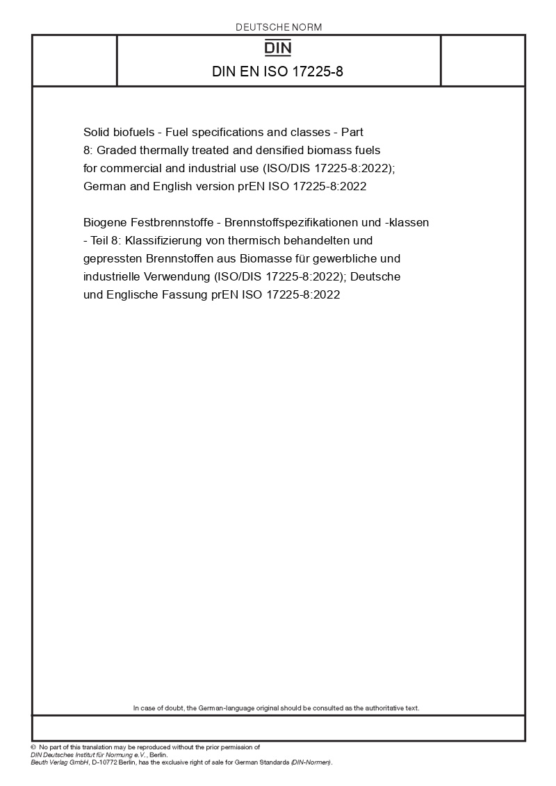 | Name: | Solid biofuels - Fuel specifications and classes - Part 8: Graded thermally treated and densified biomass fuels for commercial and industrial use (ISO 17225-8:2023) |