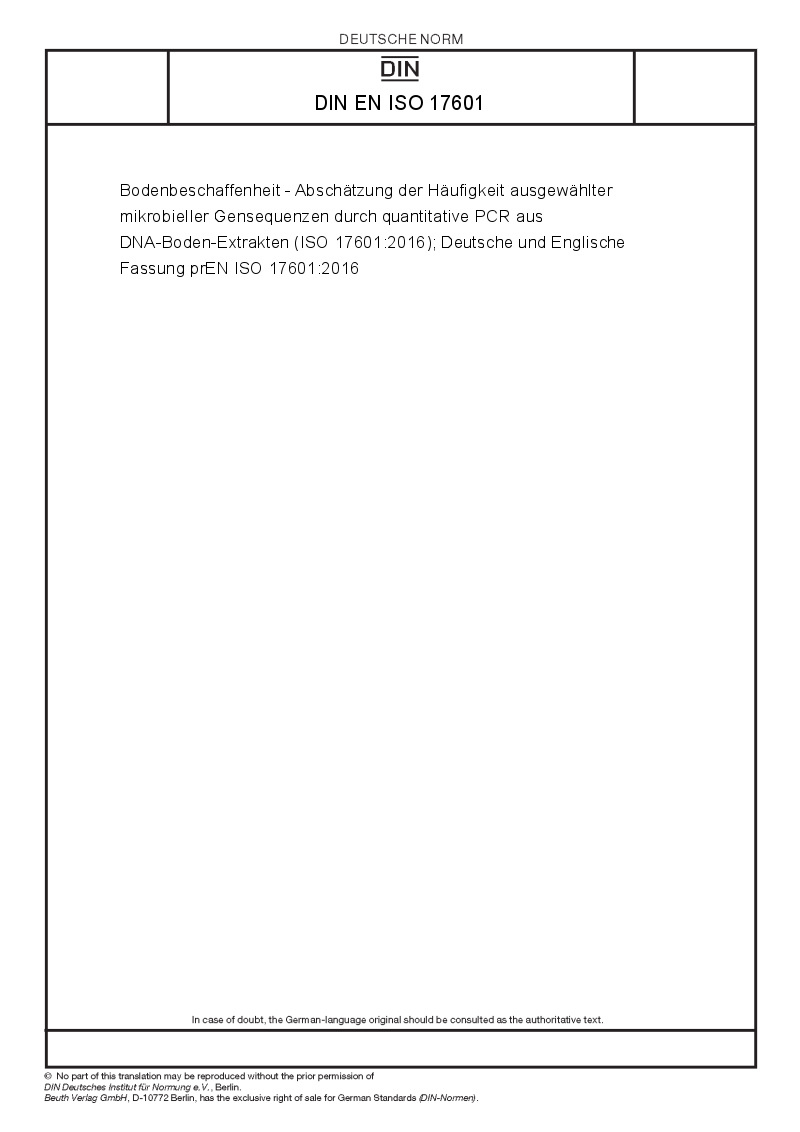 Bodenbeschaffenheit - Ermittlung der Häufigkeit ausgewählter mikrobieller Gensequenzen durch quantitative PCR aus DNA-Boden-Extrakten (ISO 17601:2016)