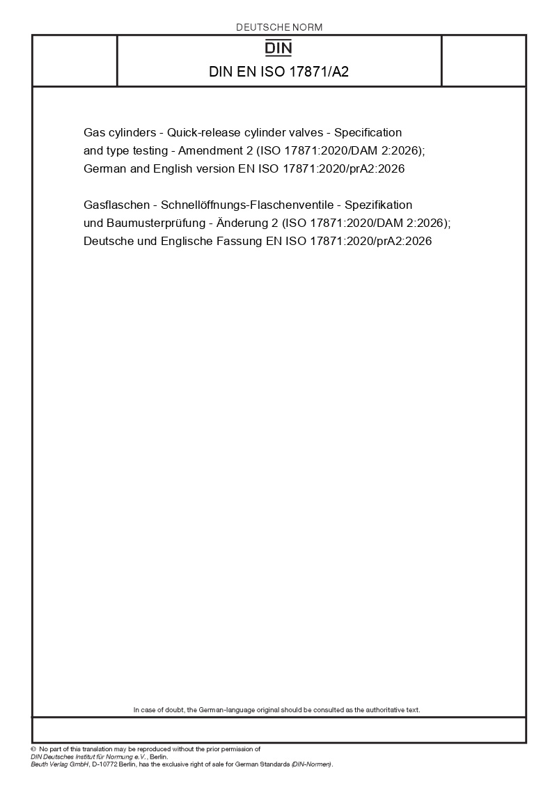| Name: | Gas cylinders - Quick-release cylinder valves - Specification and type testing - Amendment 2 (ISO 17871:2020/DAM 2:2026); German and English version EN ISO 17871:2020/prA2:2026 |