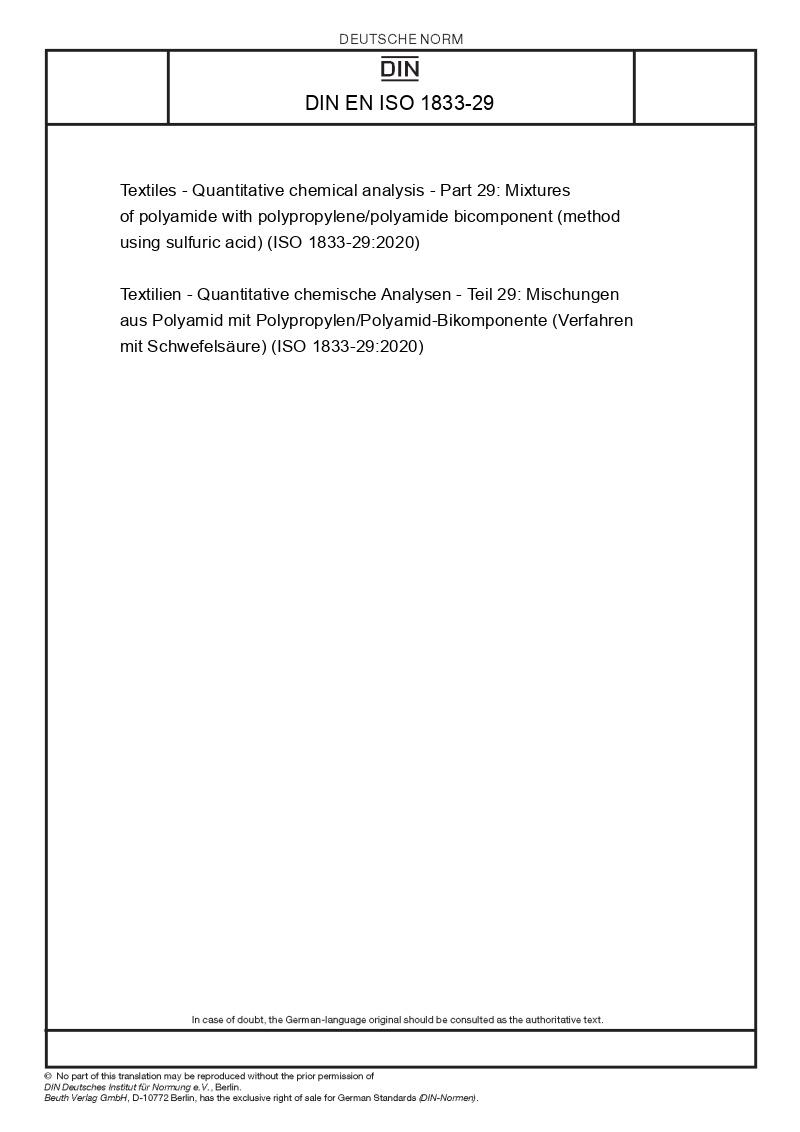 | Name: | Textiles - Quantitative chemical analysis - Part 29: Mixtures of polyamide with polypropylene/polyamide bicomponent (method using sulfuric acid) (ISO 1833-29:2020) |