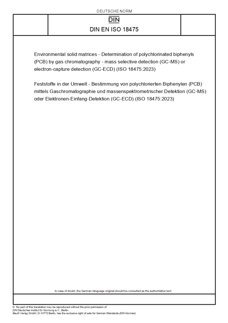 Feststoffe in der Umwelt - Bestimmung von polychlorierten Biphenylen (PCB) mittels Gaschromatographie und massenspektrometrischer Detektion (GC-MS) oder Elektronen-Einfang-Detektion (GC-ECD) (ISO 18475:2023)