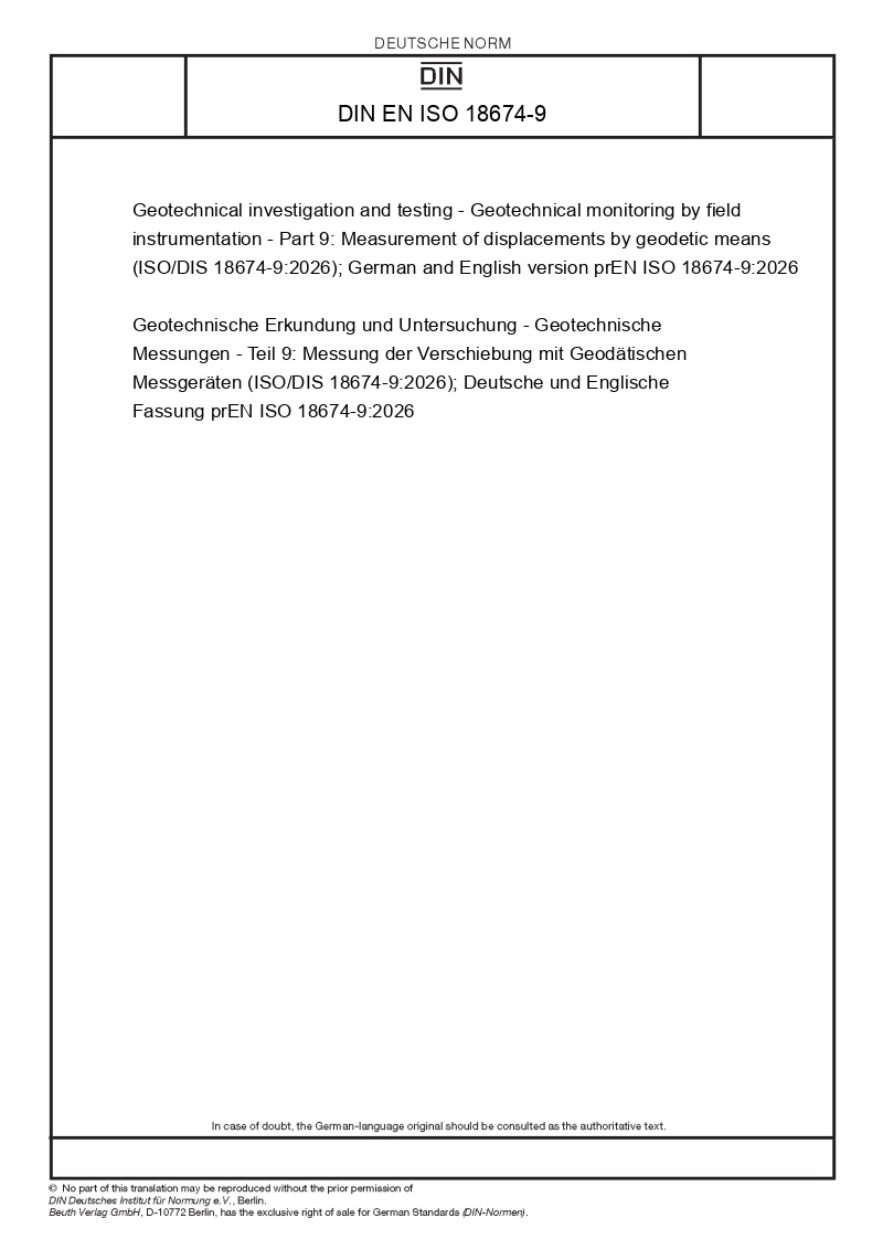 | Name: | Geotechnical investigation and testing - Geotechnical monitoring by field instrumentation - Part 9: Measurement of displacements by geodetic means (ISO/DIS 18674-9:2026); German and English version prEN ISO 18674-9:2026 |