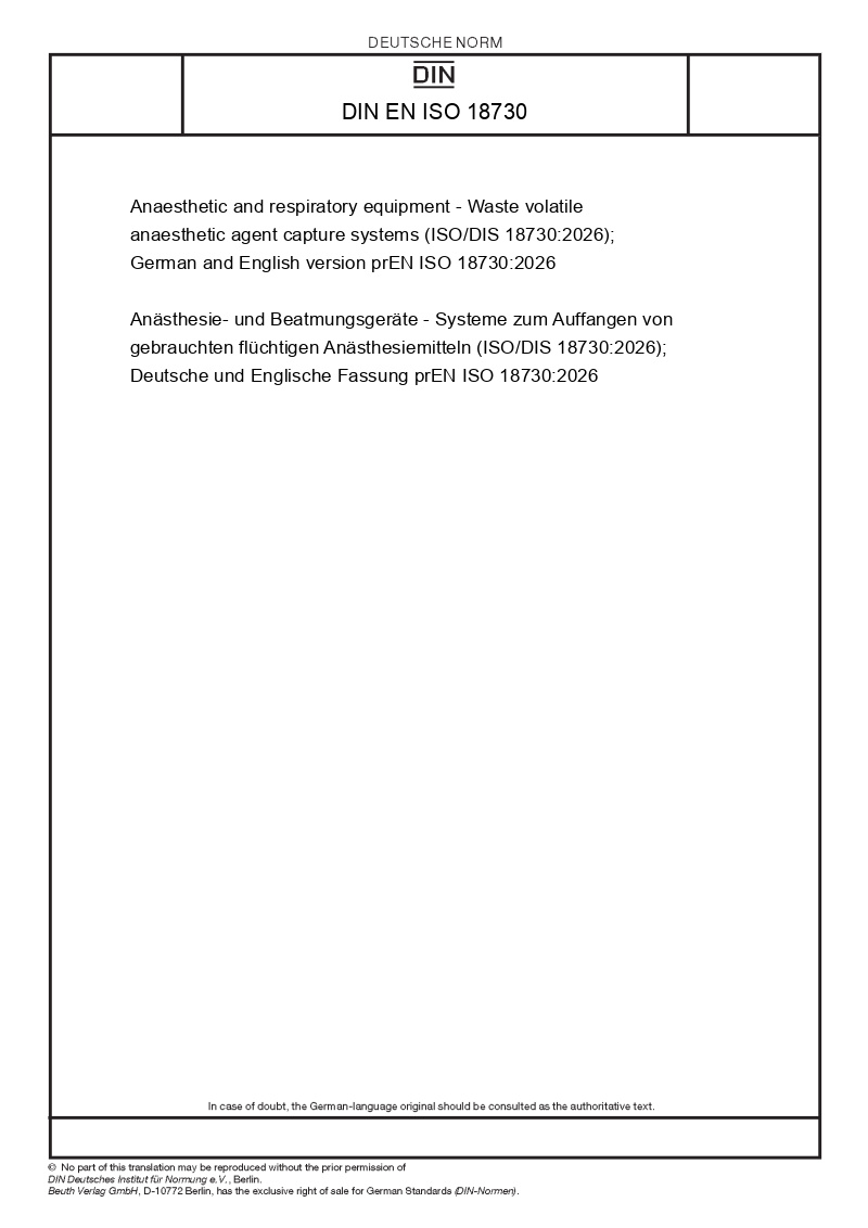 | Name: | Anaesthetic and respiratory equipment - Waste volatile anaesthetic agent capture systems (ISO/DIS 18730:2026); German and English version prEN ISO 18730:2026 |