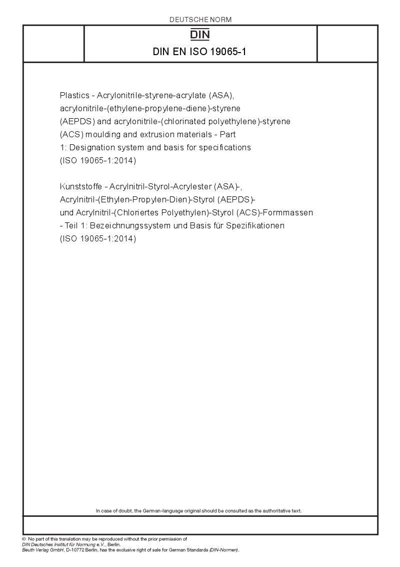 Kunststoffe - Acrylnitril-Styrol-Acrylester (ASA)-, Acrylnitril-(Ethylen-Propylen-Dien)-Styrol (AEPDS)- und Acrylnitril-(Chloriertes Polyethylen)-Styrol (ACS)-Formmassen - Teil 1: Bezeichnungssystem und Basis für Spezifikationen (ISO 19065-1:2014)
