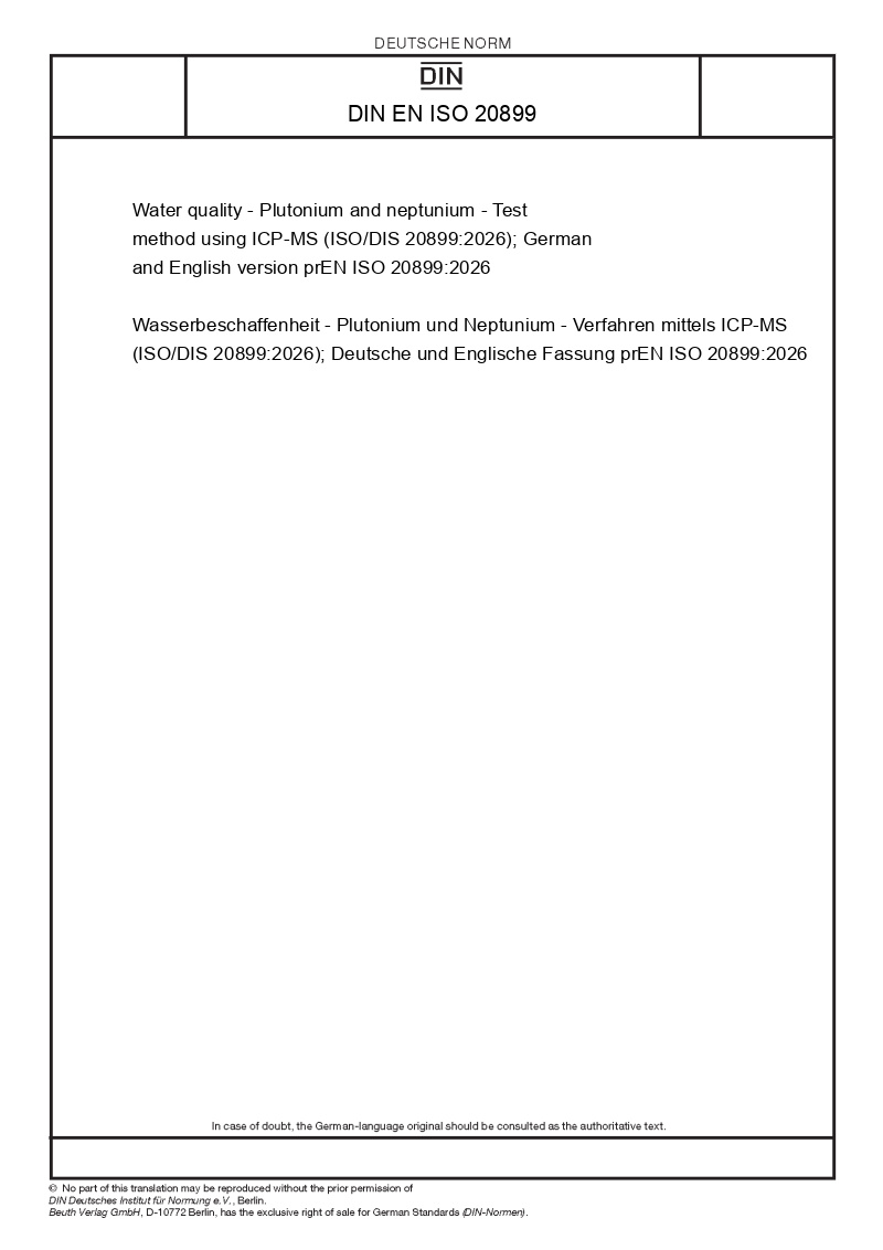 Water quality - Plutonium and neptunium - Test method using ICP-MS (ISO/DIS 20899:2026); German and English version prEN ISO 20899:2026
