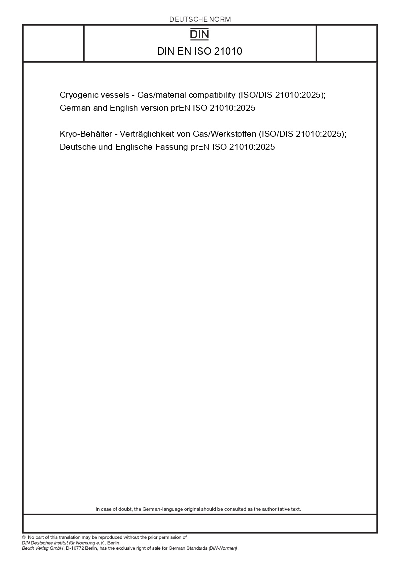 | Name: | Cryogenic vessels - Gas/material compatibility (ISO/DIS 21010:2025); German and English version prEN ISO 21010:2025 |