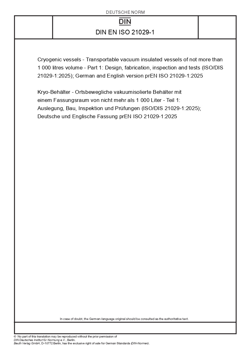 Cryogenic vessels - Transportable vacuum insulated vessels of not more than 1 000 litres volume - Part 1: Design, fabrication, inspection and tests (ISO/DIS 21029-1:2025); German and English version prEN ISO 21029-1:2025
