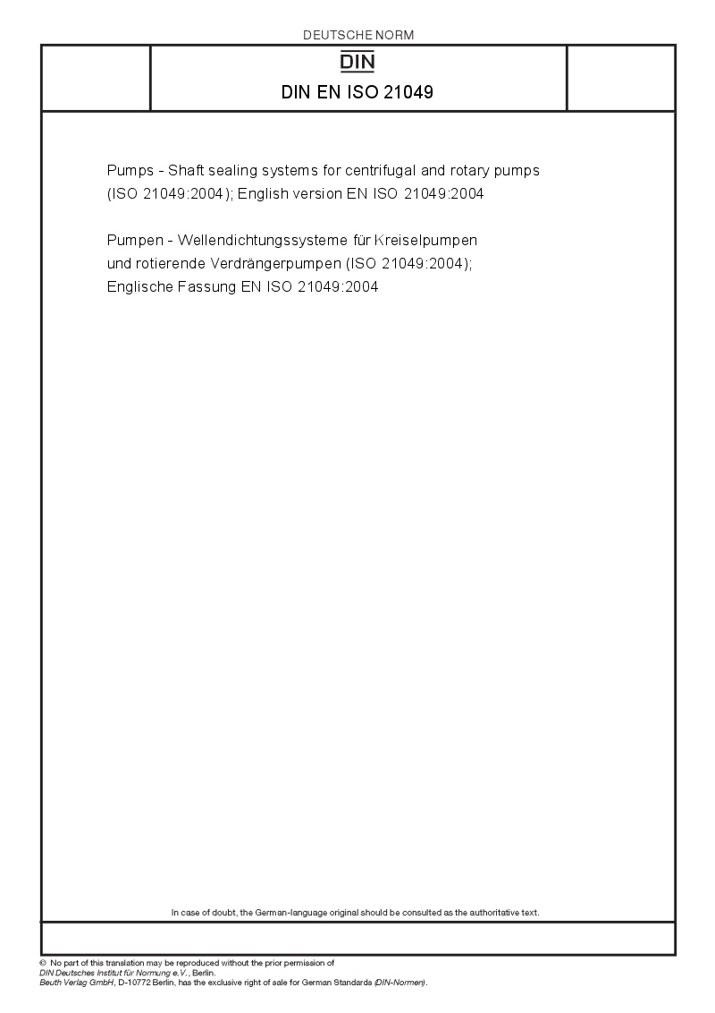 Pumpen - Wellendichtungssysteme für Kreiselpumpen und rotierende Verdrängerpumpen (ISO 21049:2004); Englische Fassung EN ISO 21049:2004