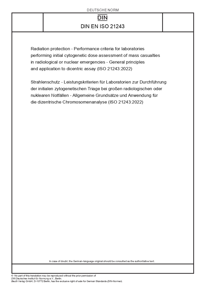 Strahlenschutz - Leistungskriterien für Laboratorien zur Durchführung der initialen zytogenetischen Triage bei großen radiologischen oder nuklearen Notfällen - Allgemeine Grundsätze und Anwendung für die dizentrische Chromosomenanalyse (ISO 21243:2022)