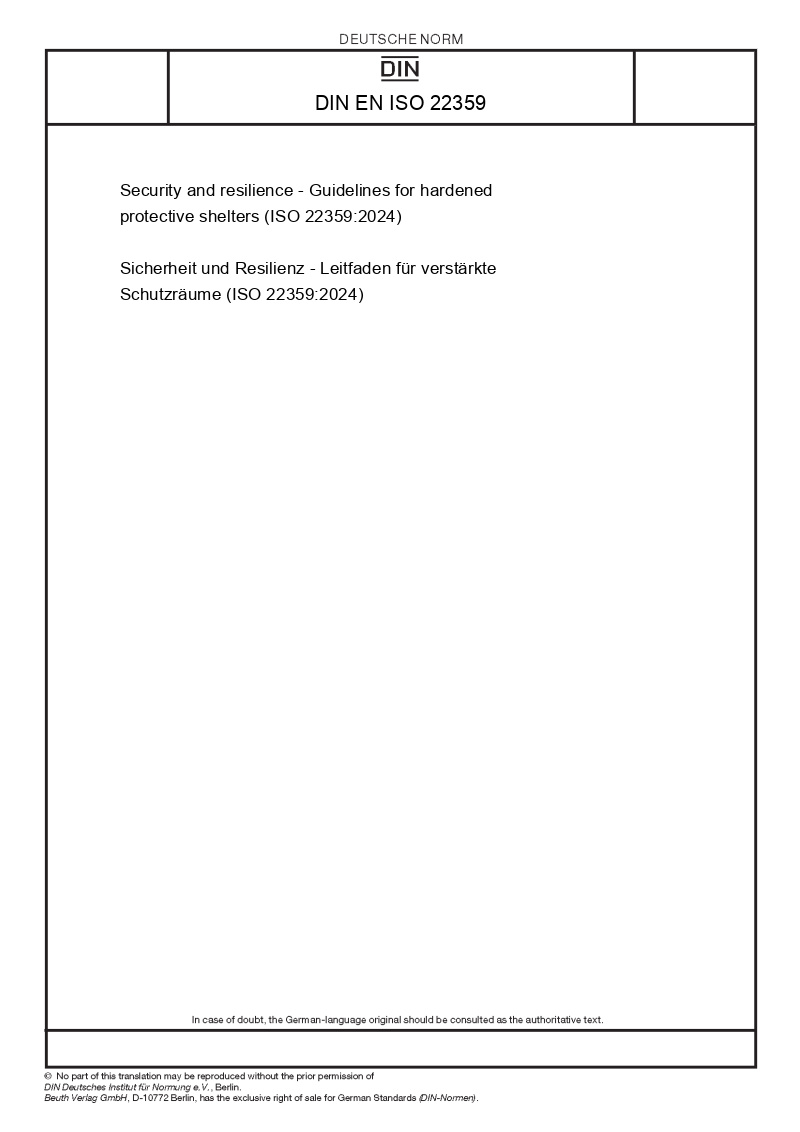 | Name: | Security and resilience - Guidelines for hardened protective shelters (ISO 22359:2024) |