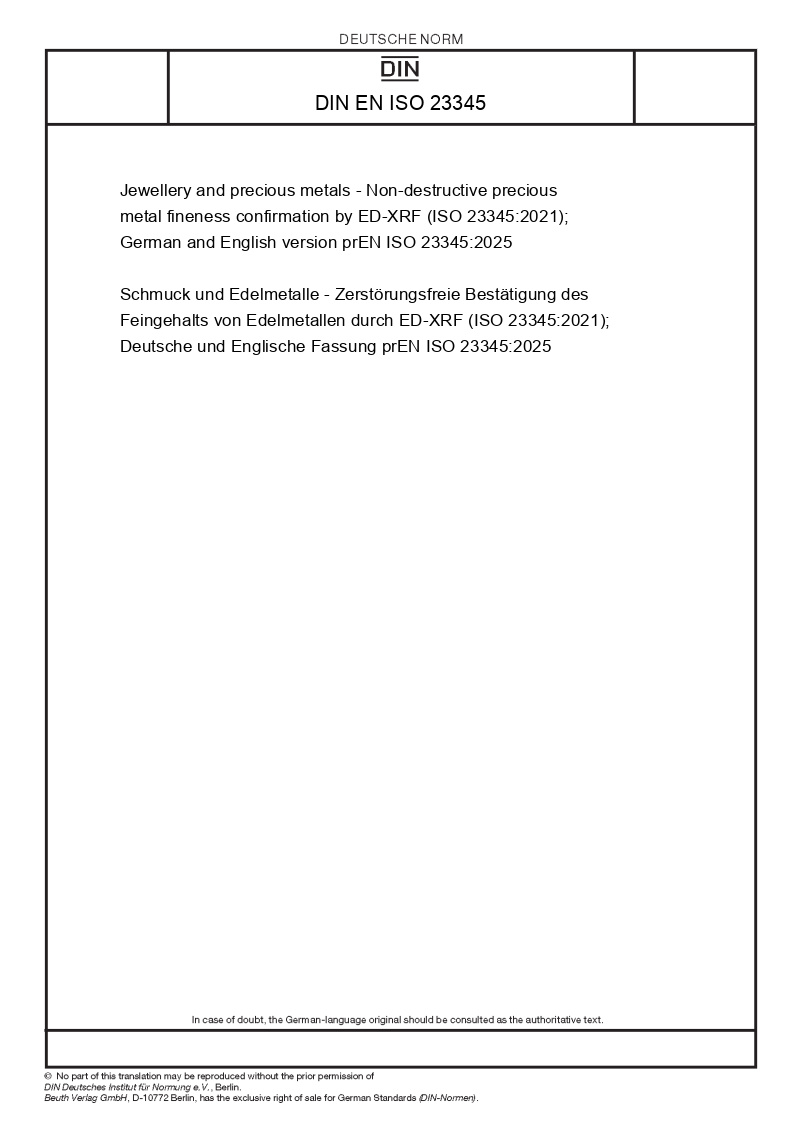 | Name: | Jewellery and precious metals - Non-destructive precious metal fineness confirmation by ED-XRF (ISO 23345:2021); German and English version prEN ISO 23345:2025 |