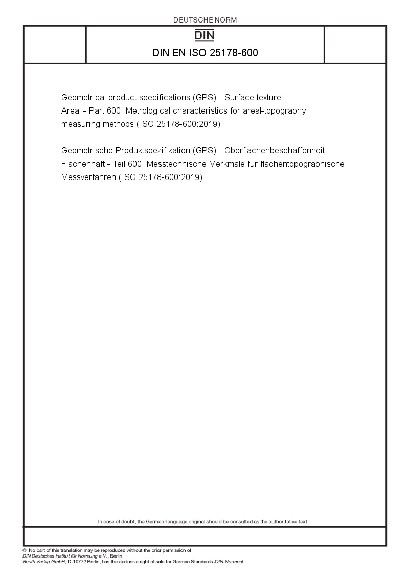 | Name: | Geometrical product specifications (GPS) - Surface texture: Areal - Part 600: Metrological characteristics for areal-topography measuring methods (ISO 25178-600:2019) |