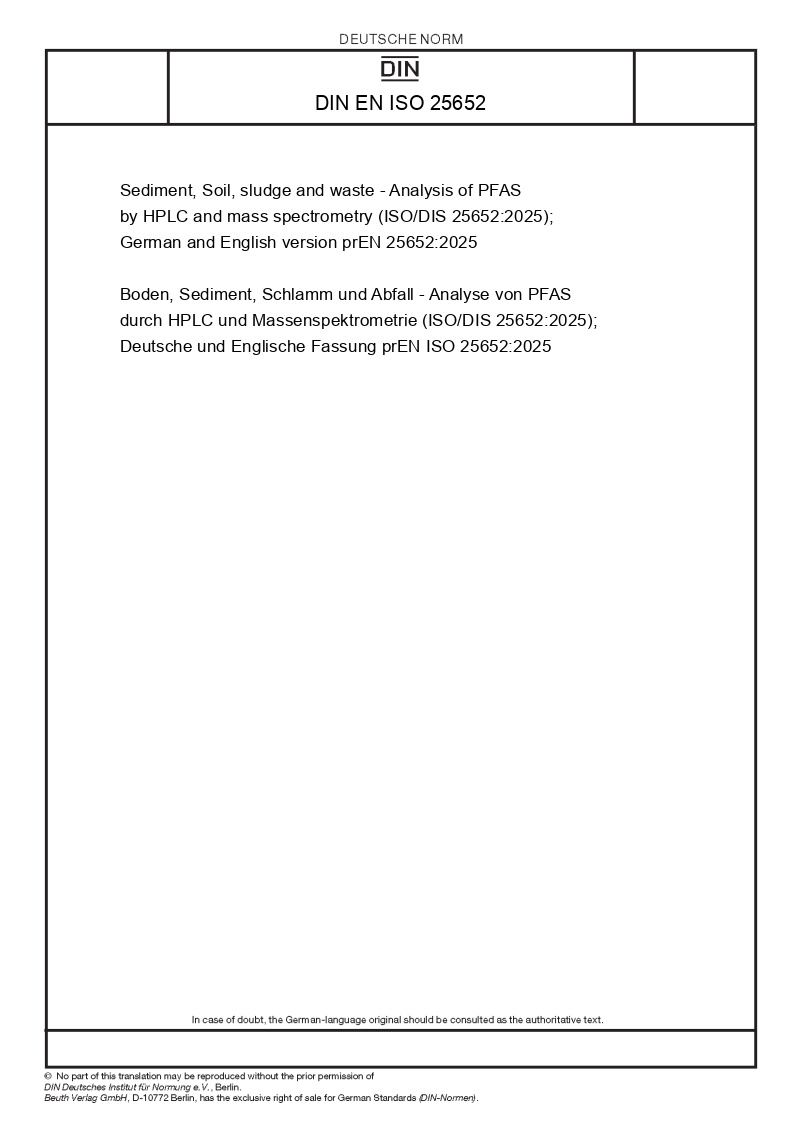 | Name: | Sediment, Soil, sludge and waste - Analysis of PFAS by HPLC and mass spectrometry (ISO/DIS 25652:2025); German and English version prEN 25652:2025 |