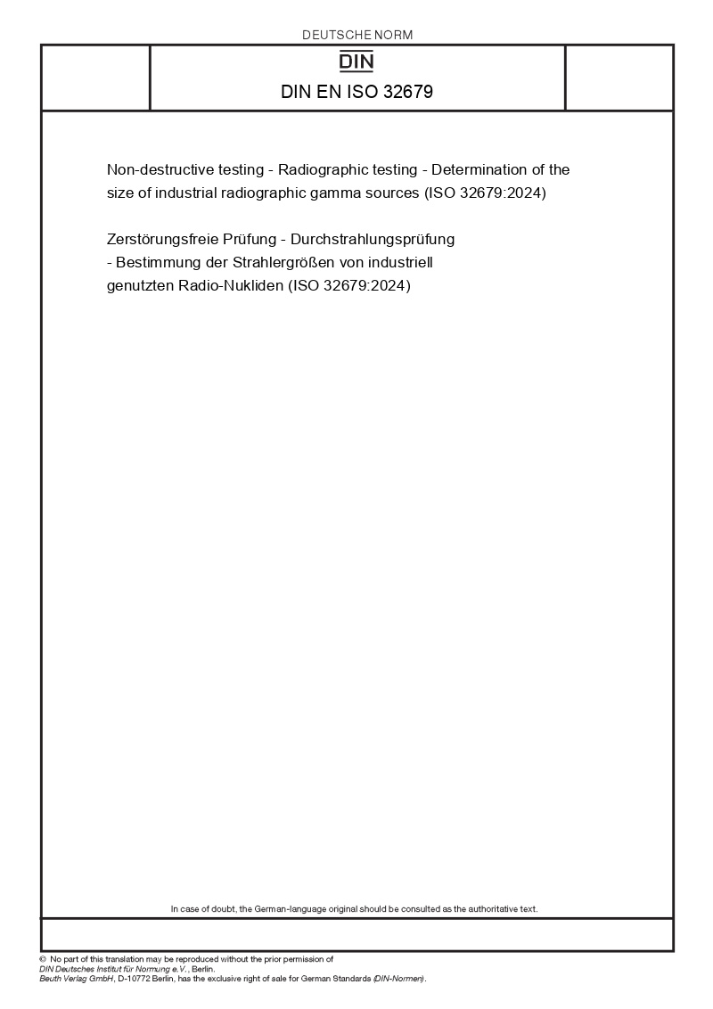| Name: | Non-destructive testing - Radiographic testing - Determination of the size of industrial radiographic gamma sources (ISO 32679:2024) |