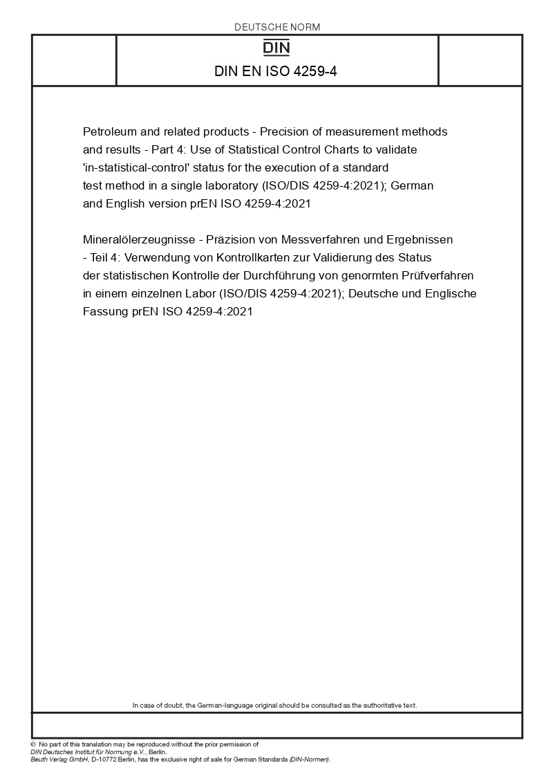 Mineralölerzeugnisse - Präzision von Messverfahren und Ergebnissen - Teil 4: Verwendung von Kontrollkarten zur Validierung des Status der statistischen Kontrolle bei der Durchführung von genormten Prüfverfahren in einem einzelnen Labor (ISO 4259-4:2021, korrigierte Fassung 2023-10)
