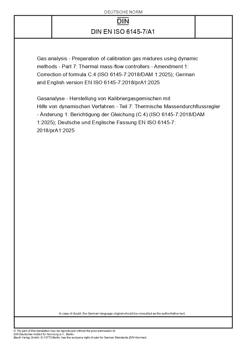 | Name: | Gas analysis - Preparation of calibration gas mixtures using dynamic methods - Part 7: Thermal mass-flow controllers - Amendment 1: Correction of formula C.4 (ISO 6145-7:2018/DAM 1:2025); German and English version EN ISO 6145-7:2018/prA1:2025 |