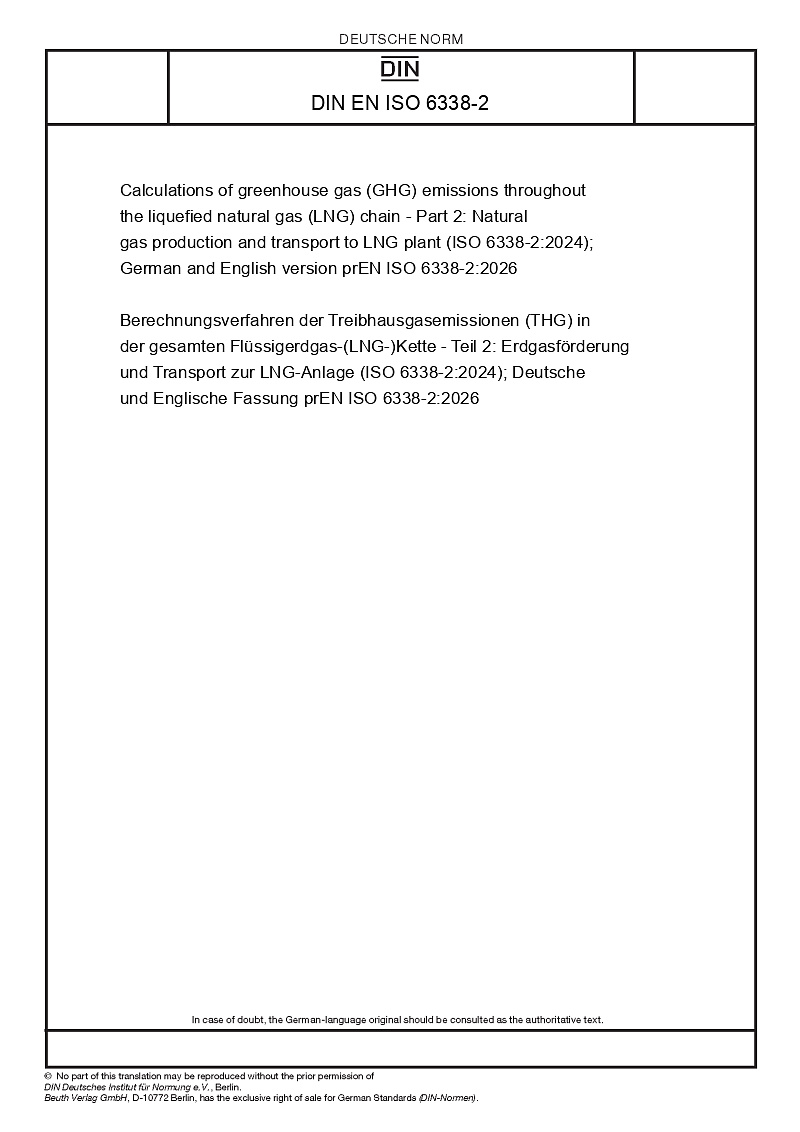 | Name: | Calculations of greenhouse gas (GHG) emissions throughout the liquefied natural gas (LNG) chain - Part 2: Natural gas production and transport to LNG plant (ISO 6338-2:2024); German and English version prEN ISO 6338-2:2026 |