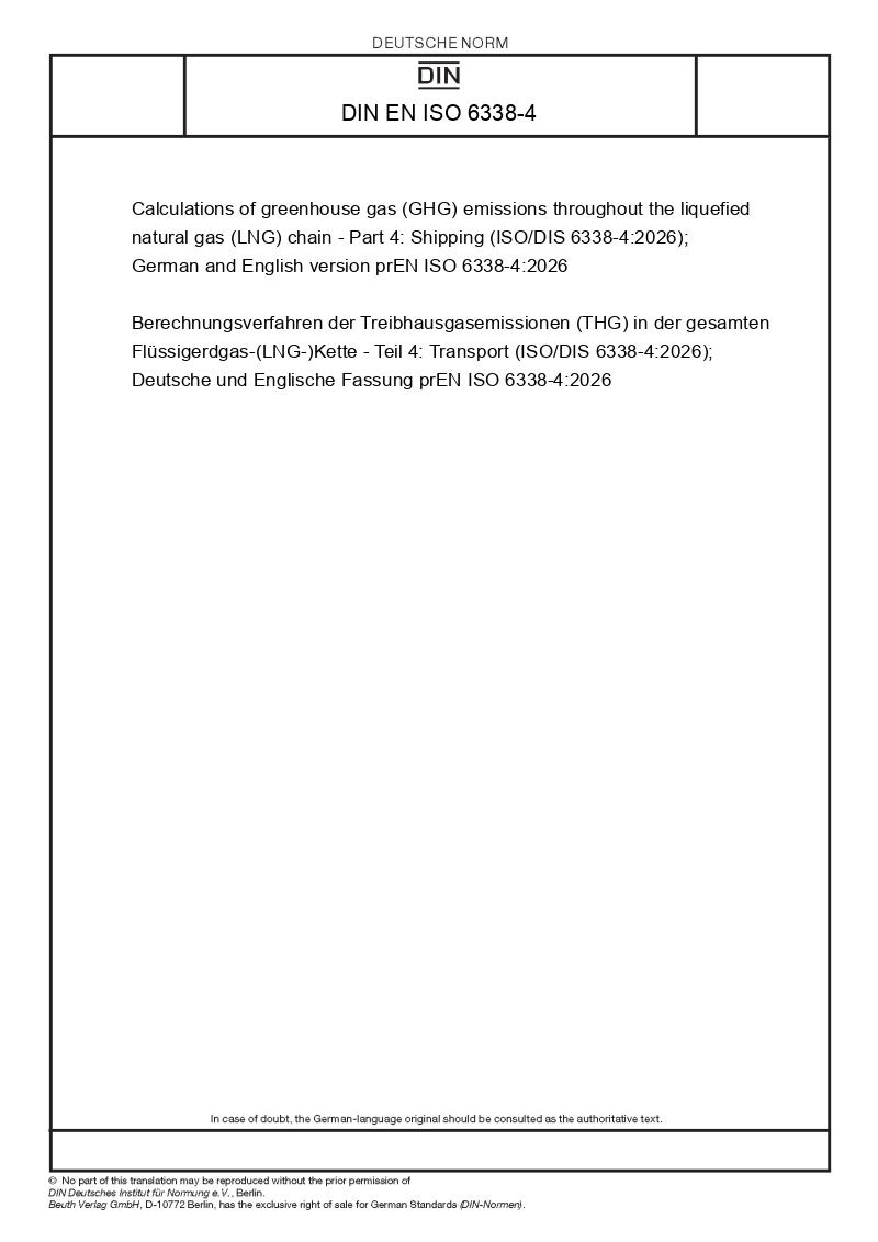 | Name: | Calculations of greenhouse gas (GHG) emissions throughout the liquefied natural gas (LNG) chain - Part 4: Shipping (ISO/DIS 6338-4:2026); German and English version prEN ISO 6338-4:2026 |