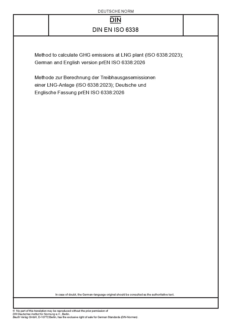 | Name: | Method to calculate GHG emissions at LNG plant (ISO 6338:2023); German and English version prEN ISO 6338:2026 |