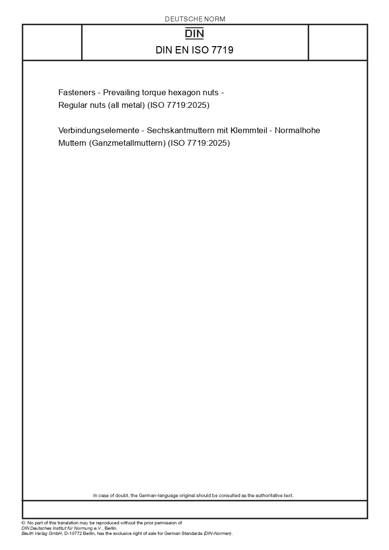 | Name: | Fasteners - Prevailing torque hexagon nuts - Regular nuts (all metal) (ISO 7719:2025) |