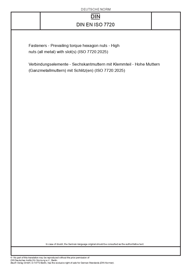 | Name: | Fasteners - Prevailing torque hexagon nuts - High nuts (all metal) with slot(s) (ISO 7720:2025) |