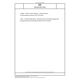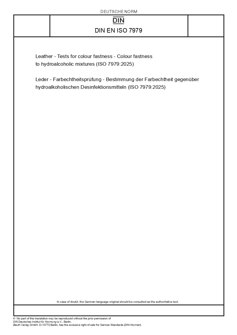 | Name: | Leather - Tests for colour fastness - Colour fastness to hydroalcoholic mixtures (ISO 7979:2025) |