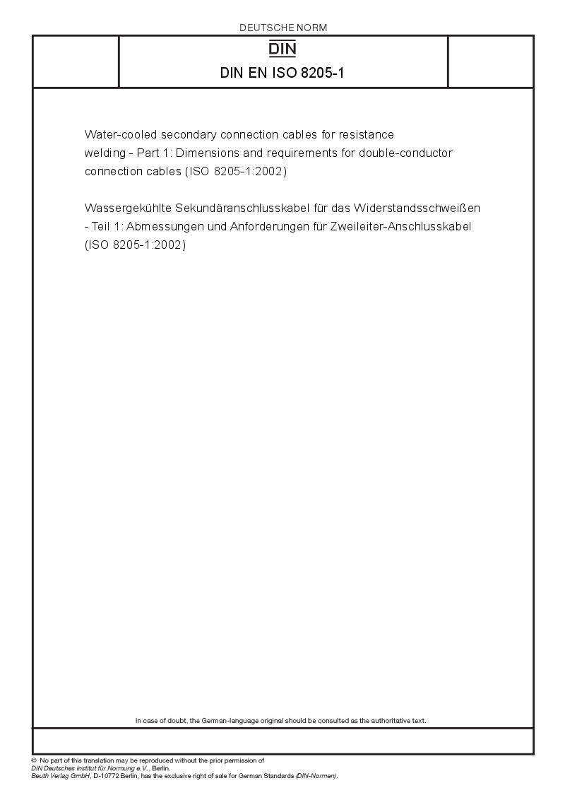 | Name: | Water-cooled secondary connection cables for resistance welding - Part 1: Dimensions and requirements for double-conductor connection cables (ISO 8205-1:2002) |