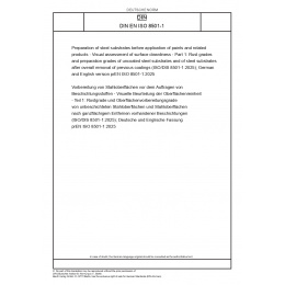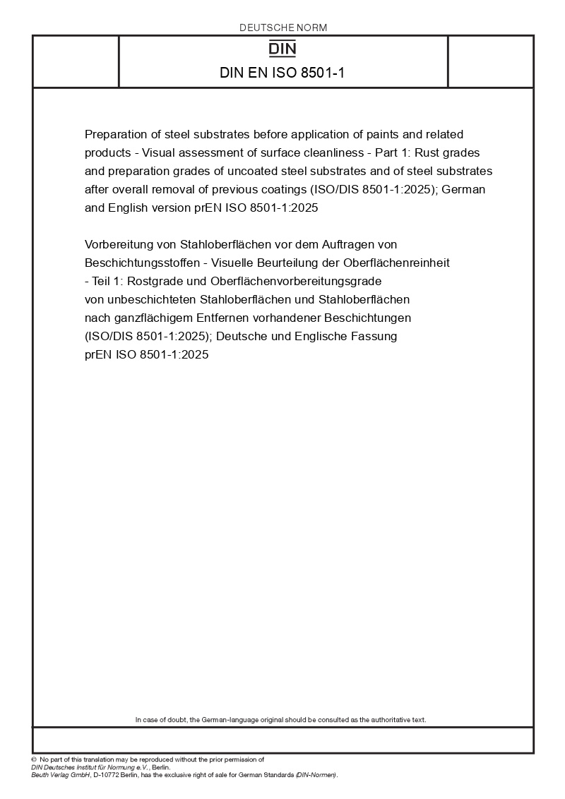 | Name: | Preparation of steel substrates before application of paints and related products - Visual assessment of surface cleanliness - Part 1: Rust grades and preparation grades of uncoated steel substrates and of steel substrates after overall removal of previous coatings (ISO/DIS 8501-1:2025); German and English version prEN ISO 8501-1:2025 |