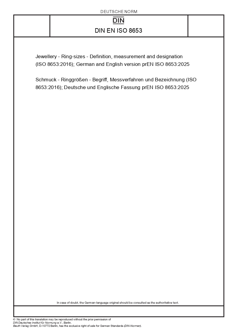 | Name: | Jewellery - Ring-sizes - Definition, measurement and designation (ISO 8653:2016); German and English version prEN ISO 8653:2025 |