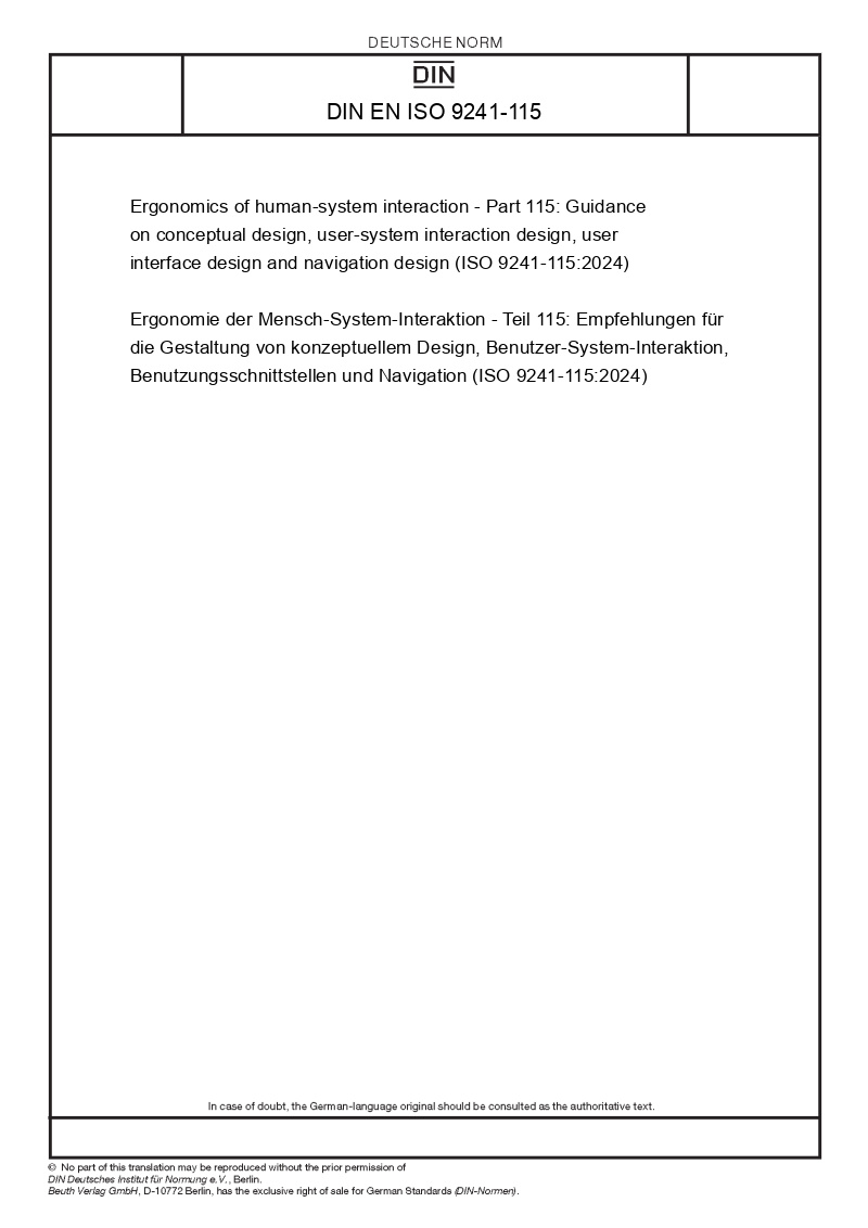 | Name: | Ergonomics of human-system interaction - Part 115: Guidance on conceptual design, user-system interaction design, user interface design and navigation design (ISO 9241-115:2024) |