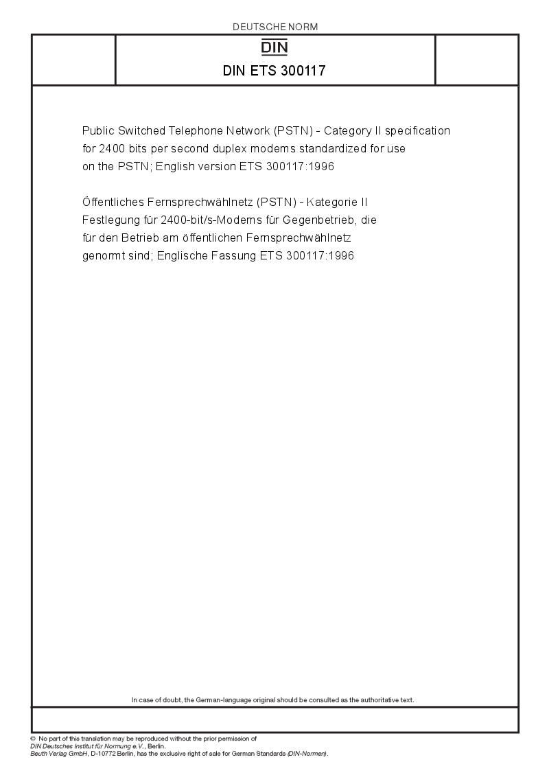 | Name: | Public Switched Telephone Network (PSTN) - Category II specification for 2400 bits per second duplex modems standardized for use on the PSTN; English version ETS 300117:1996 |