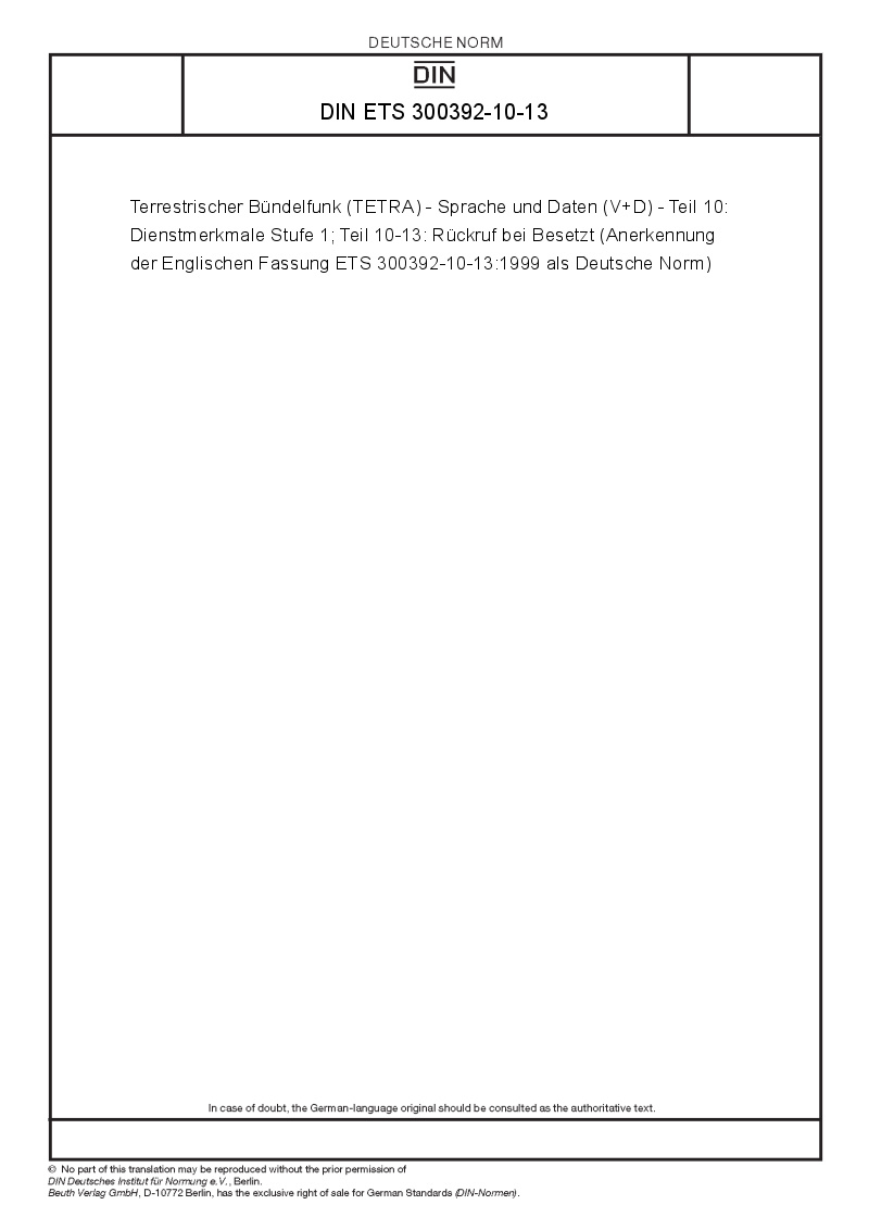 Terrestrischer Bündelfunk (TETRA) - Sprache und Daten (V+D) - Teil 10: Dienstmerkmale Stufe 1; Teil 10-13: Rückruf bei Besetzt (Anerkennung der Englischen Fassung ETS 300392-10-13:1999 als Deutsche Norm)