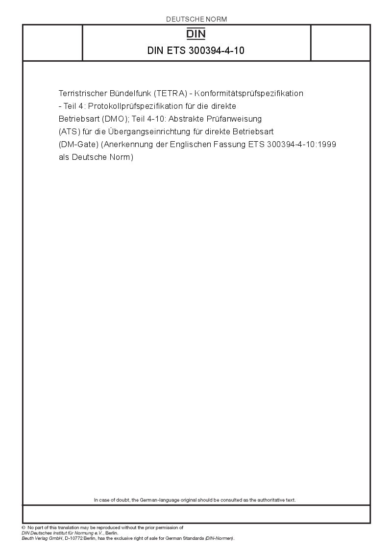 Terristrischer Bündelfunk (TETRA) - Konformitätsprüfspezifikation - Teil 4: Protokollprüfspezifikation für die direkte Betriebsart (DMO); Teil 4-10: Abstrakte Prüfanweisung (ATS) für die Übergangseinrichtung für direkte Betriebsart (DM-Gate) (Anerkennung der Englischen Fassung ETS 300394-4-10:1999 als Deutsche Norm)