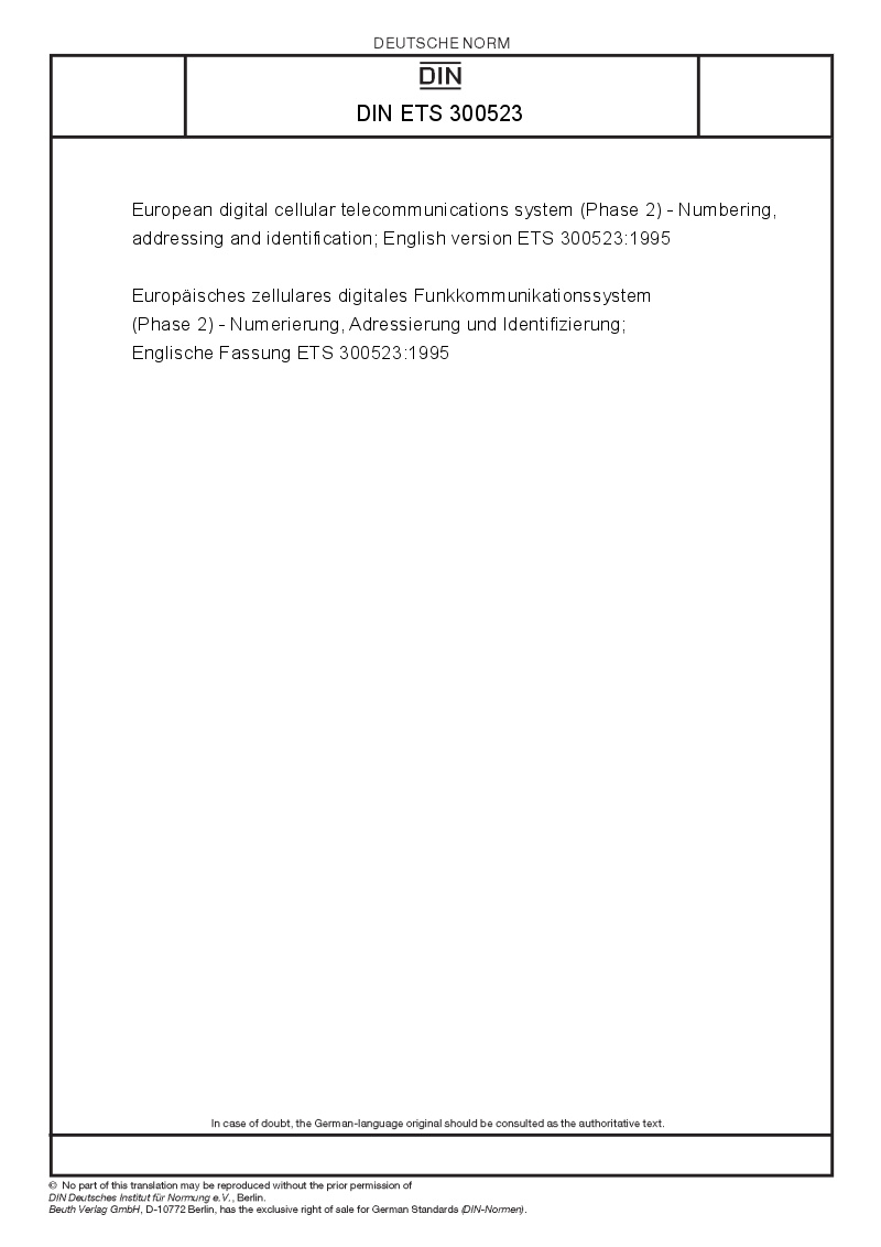 | Name: | European digital cellular telecommunications system (Phase 2) - Numbering, addressing and identification; English version ETS 300523:1995 |