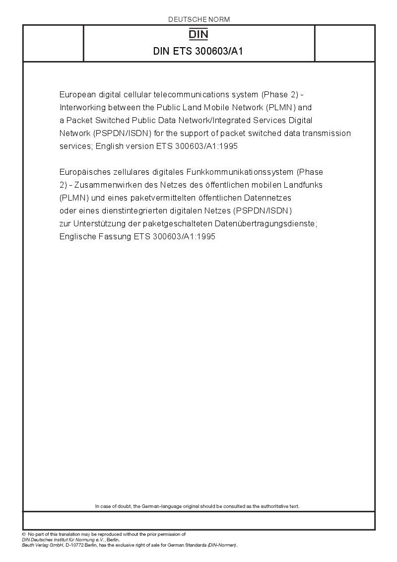 | Name: | European digital cellular telecommunications system (Phase 2) - Interworking between the Public Land Mobile Network (PLMN) and a Packet Switched Public Data Network/Integrated Services Digital Network (PSPDN/ISDN) for the support of packet switched data transmission services; English version ETS 300603/A1:1995 |