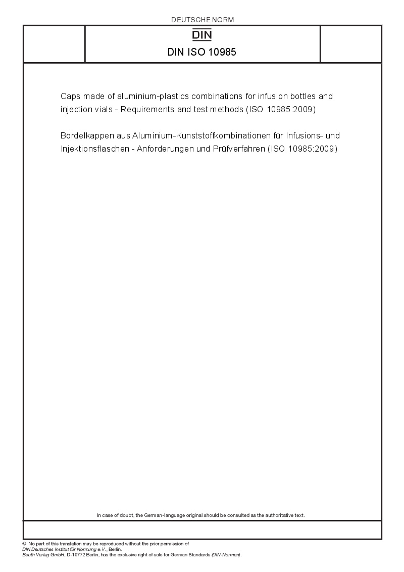 >DIN Standards>DIN ISO 10985 Caps made of aluminium-plastics combinations for infusion bottles and injection vials - Requirements and test methods (ISO 10985:2009)