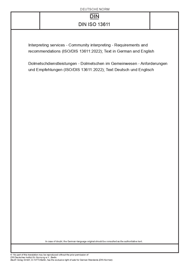 | Name: | Interpreting services - Community interpreting - Requirements and recommendations (ISO/DIS 13611:2022); Text in German and English |