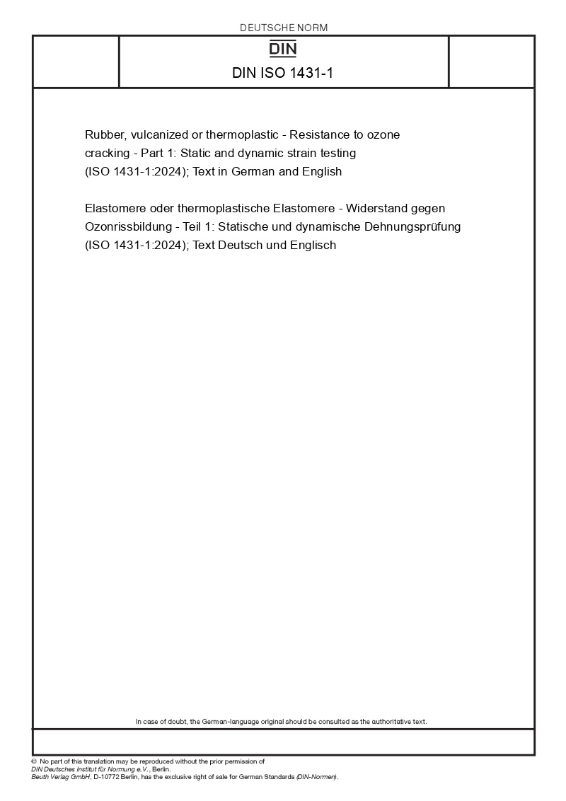 Rubber, vulcanized or thermoplastic - Resistance to ozone cracking - Part 1: Static and dynamic strain testing (ISO 1431-1:2024); Text in German and English