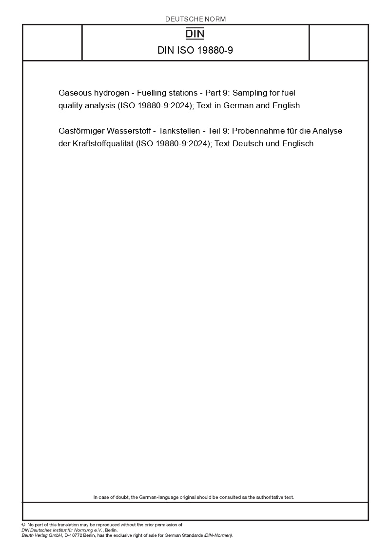 Name: | Gaseous hydrogen - Fuelling stations - Part 9: Sampling for fuel quality analysis (ISO 19880-9:2024); Text in German and English |