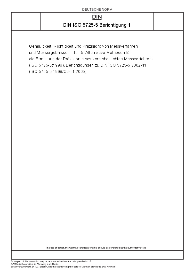 | Name: | Accuracy (trueness and precision) of measurement methods and results - Part 5: Alternative methods for the determination of the precision of a standard measurement method (ISO 5725-5:1998), Corrigenda to DIN ISO 5725-5:2002-11 (ISO 5725-5:1998/Cor. 1:2005) |