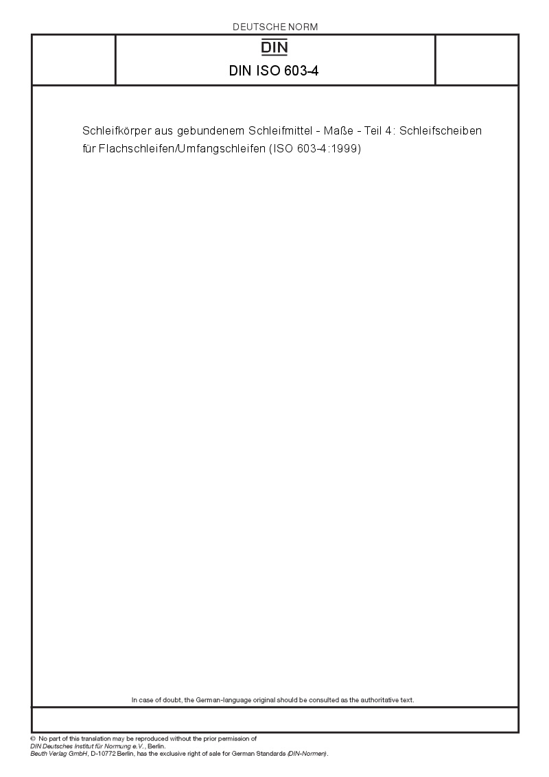 >DIN Standards>DIN ISO 603-4 Schleifkörper aus gebundenem Schleifmittel - Maße - Teil 4: Schleifscheiben für Flachschleifen/Umfangschleifen (ISO 603-4:1999)